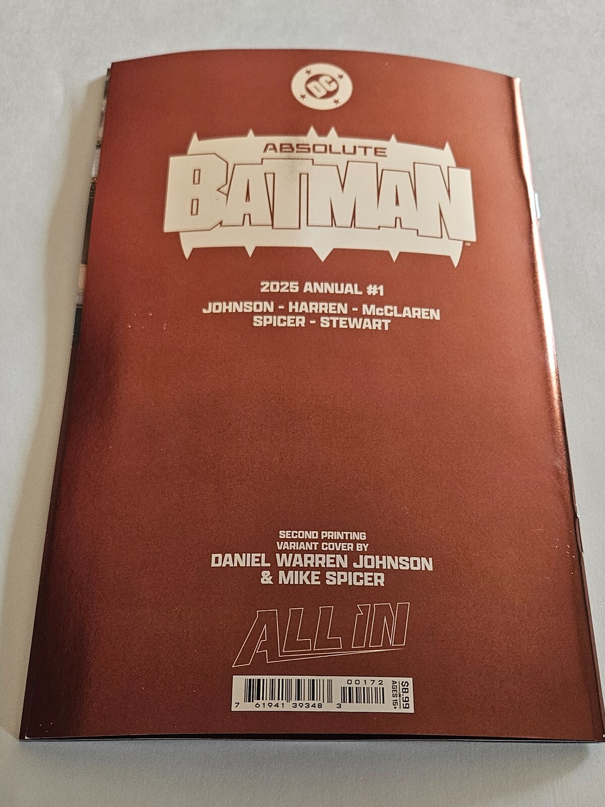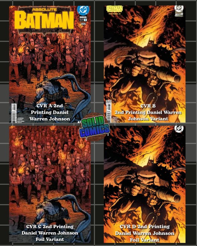 Condition: Front covers are all NM, however the Cover C 2nd Printing Daniel Warren Johnson Foil Variant back ... Read more about the seller notes Front covers are all NM, however the Cover C 2nd Printing Daniel Warren Johnson Foil Variant back cover has few minor cover rubs on all issues from distribution Read Less about the seller notesABSOLUTE BATMAN ANNUAL #1 2nd Print 4 Variant Cover SetLot includes all 4 covers for the 2nd print...Cover A 2nd Printing Daniel Warren JohnsonCover B 2nd Printing Daniel Warren Johnson VariantCover C 2nd Printing Daniel Warren Johnson Foil VariantCover D 2nd Printing Daniel Warren Johnson Foil VariantAll comics are new unless noted, purchase is for the item in the picture. They will come bagged and boarded. I do not grade comics, however, if listed as new, they are brand new and higher grade comics.Shipping for a single comic is $5.95 flat, each additional comic is $0.45.Lots $6.92 eachOmnibus shipping is $8.5 eachGraded comics shipping is $13.49 flat, each additional graded comic is $3