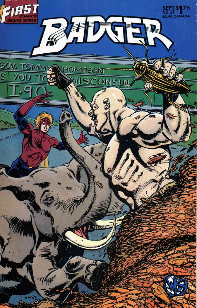 Item: Badger #27 | Publisher: First | Cover Date: September 1987 | Writer: Mike Baron | Artist: Bill Reinhold, Dave Garcia | Cover Artist: Bill Reinhold | Storylines: The Roach Wrangler, Part 2; McSleaze in Sleazed Out | Notes: Roach Wrangler | With Economy shipping, each additional comic ships for just 50 cents more to customers in the USA. This listing contains a stock photo and information from ComicBase™ and © Human Computing. The stock photo is for reference only. If you would like to see a photo of the actual item, please message us prior to purchasing.Seller Information