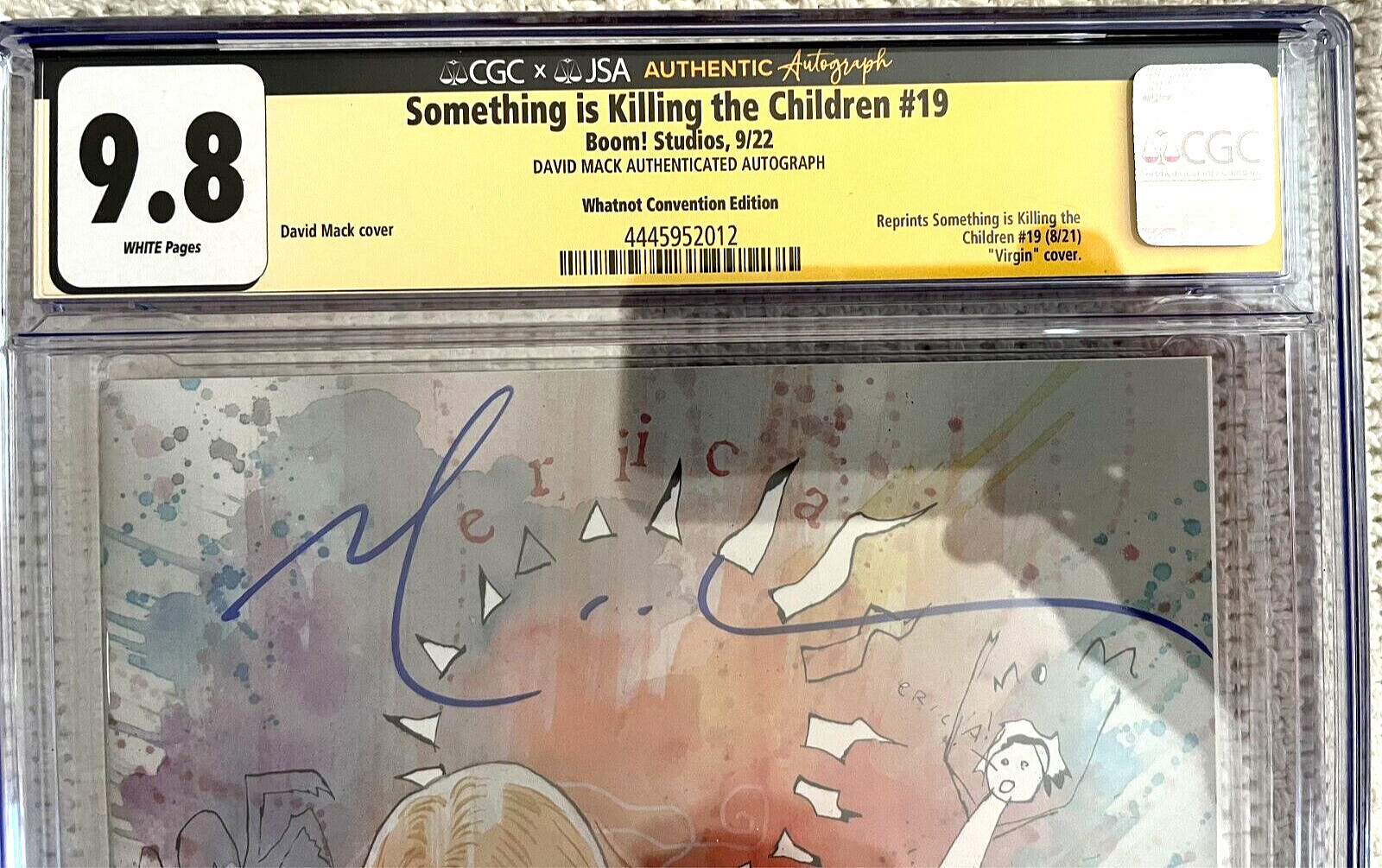 Grade: 9.8 Near Mint/MintSALE*** Buy 2 items - GET 10% OFFBuy 3 items - GET 15% OFFBuy 4 items - GET 20% OFFplus Discounted Combined ShippingPlace items into Cart and send a REQUEST an INVOICE to receive Quantity & Shipping Discounts?HOT? BOOM! STUDIOSSOMETHING IS KILLING THE CHILDREN #19DAVID MACKWHATNOT CONVENTIONVIRGIN VARIANTSigned byMACKCGC 9.8 This great SIGNED SIKTC Collectible is CGC sealed and comes from a C0VID-free/smoke-free/pet-free environment.Please see pics.TWO SHIPPING OPTIONS AVAILABLEAsk all question before purchase - thanks!CHECK OUT ACE'S Hip STORE FOR MORE GREAT ITEMS!Be sure to add us to your favorites list!Thanks for Shopping at Ace's Place!!?HOT?