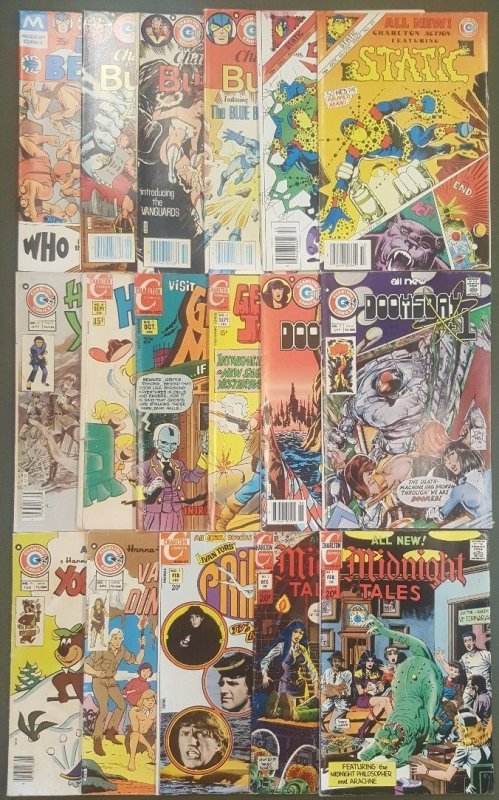 Blue beetle (modern 1977) #1, charlton action featuring static (1985) #11, #12, charlton bullseye (1981-1982) #1, #4, #9, doomsday plus one (1975-1975) #2, #7, geronimo jones (1971) #1, ghost manor (1971) #1, hi & l ... Read More