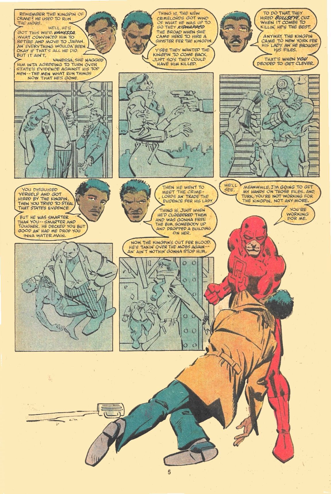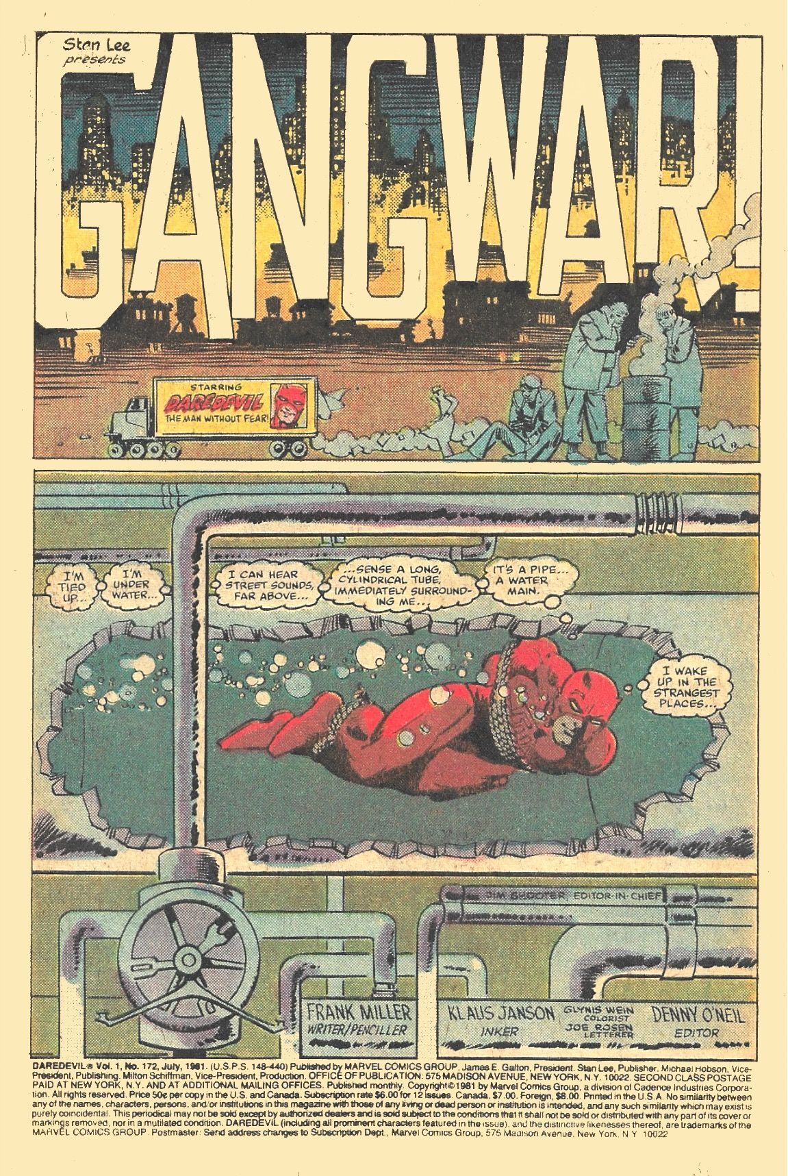 In "Gang War!", here in issue #172 from 1981, Frank Miller, in the roles of both scripter and penciller (and aided by inker Klaus Janson) tells how KINGPIN, thinking his wife is dead, takes control of the Mob and hires BULLSEYE as his assassin. DAREDEVIL comes calling and takes BULLSEYE down, but leaves the KINGPIN in power to rebuild his organization.
