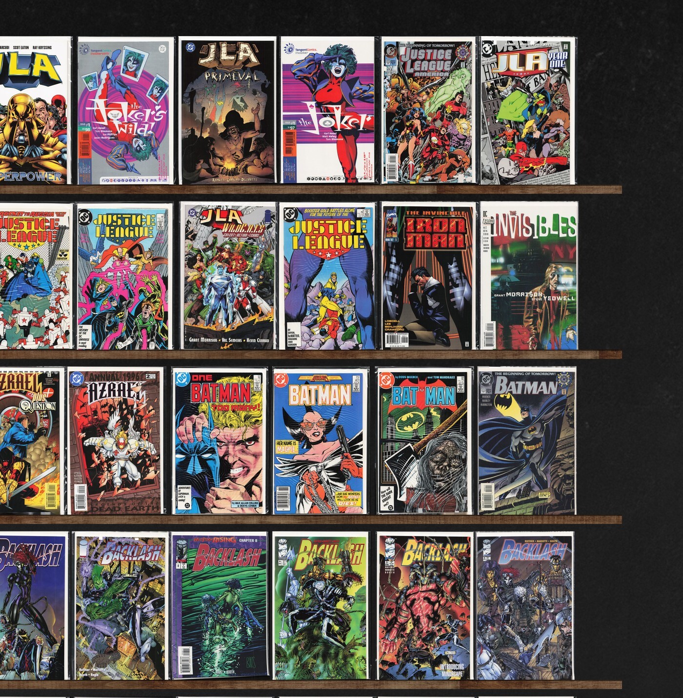Batman, Backlash, Jla: Year One, Avengers, Jla, Badrock & Company, The Invisibles, The New Titans, Justice League, Justice League America, Iron Man, Jlx (1996) Jlx, Judge Dredd, Generation X, Badrock, Javerts (1994), Jonah Hex, Jla/Wildc.A.T.S (1997) Wildc.A.T.S, Barb Wire, Azrael Annual, Shadowhawk, Shaman'S Tears