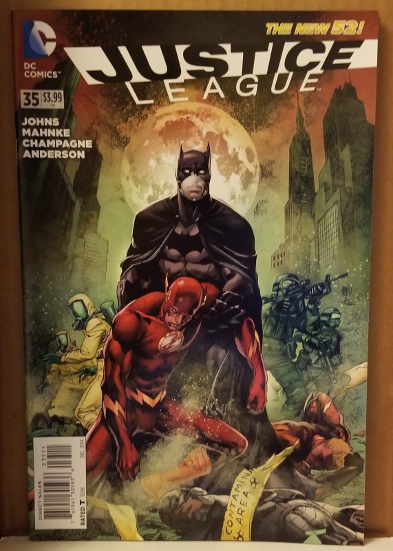 Justice League #35 by DC Comics copyright 2014. I have graded the comic book, using the Overstreet Grading Guide, at FINE/VERY FINE with the following defects: Couple of light stress marks along the spine. The corners are starting to round. There is some light yellowing of the pages.Seller Information