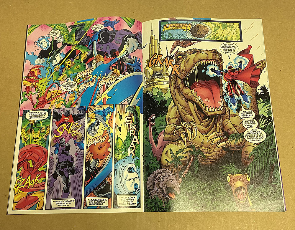 * "Born Again!" Story by Tom Peyer. Art by Barry Kitson and Dan Panosian. In order to save two universes, the young hero known as Access was forced to use the power of Amalgam (see Marvel versus DC (1996) #3). In this issue, Magneto's loyal friends have fallen in battle. So he recreates them in the form of the robotic Magnetic Men (Metal Men/Brotherhood of Evil Mutants). But will they survive a visit to Krakoa, the Living Dinosaur Island?