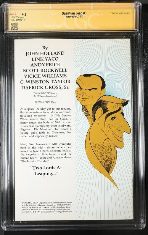 Grade: 9.2 Near Mint-Get your hands on a rare edition of Quantum Leap (1992) #3 comic book, graded CGC 9.2 Near Mint- and signed by both the artist/writer John Holland and the cover artist C. Winston Taylor. This modern age US comic features the iconic time-travelling adventures of Dr. Sam Beckett and his holographic companion Ziggy. But that's not all. This particular copy is also signed by Deborah Pratt, the co-creator and executive producer of the Quantum Leap TV series. She adds the inscription "&" Creator & Ziggy" to her signature, making this a unique and valuable addition to any collection. Published by Innovation in 1992, this comic book is a must-have for fans of the series and collectors of comic book memorabilia.Census = 1 .