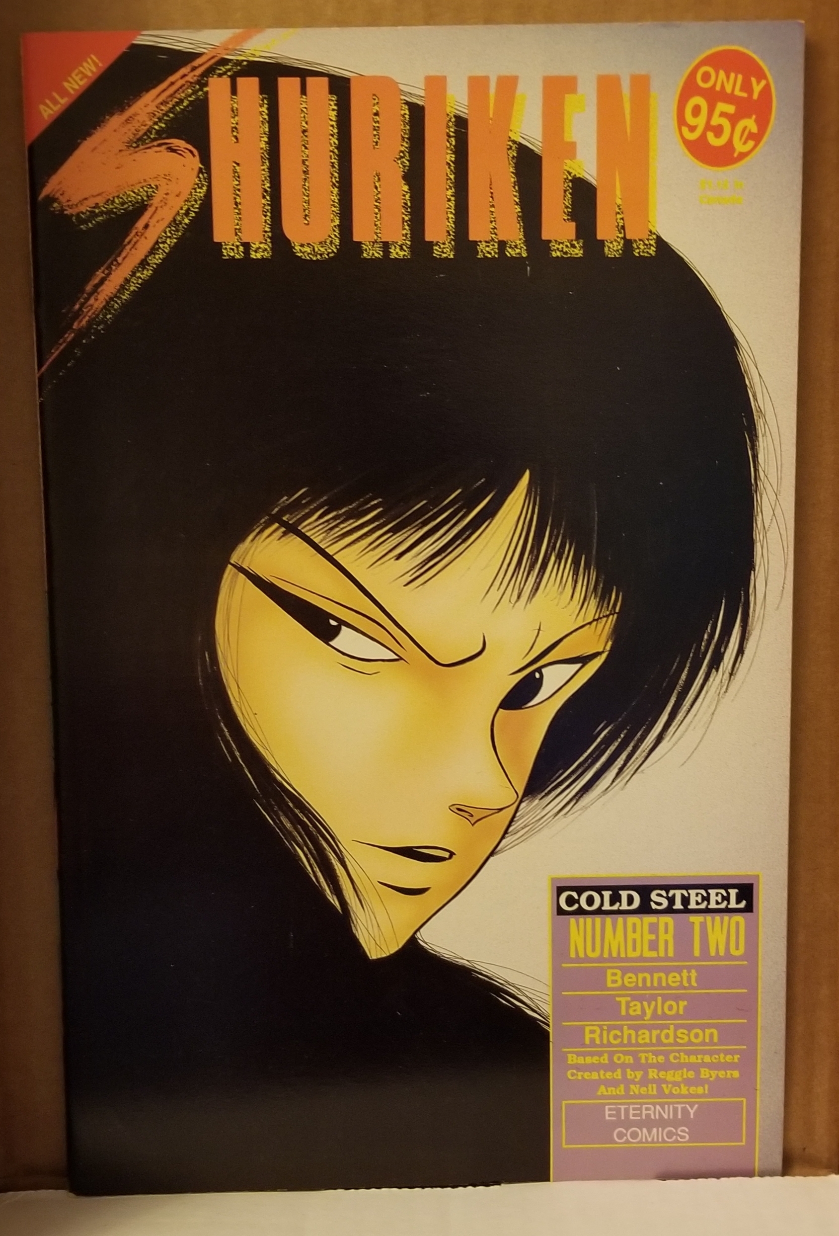 Shuriken: Cold Steel #2 by Eternity Comics copyright 1994. I have graded the comic book, using the Overstreet Grading Guide, at FINE/VERY FINE with the following defects: Light stress marks along the the spine. The corners are rounded. There is light yellowing of the pages.Seller Information